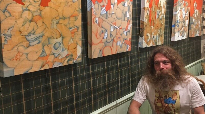 En sirotant un café ou en dégustant leur repas, les clients du restaurant auront le temps d’apprécier le travail complexe des œuvres de Mantha. « Mon processus est minutieux, explique-t-il. Je travaille sur bois aux crayons rouge et bleu et aux marqueurs à peinture acrylique. Certains tableaux sont mats et d’autres finis avec une résine lustrée. » Les tableaux sont sans titres, permettant aux gens de découvrir leur propre sens dans l’enchev trement de membres humains, d’éléments architecturaux et de formes géométriques stylisées qui sortent de l’imaginaire de l’artiste. Alix Mantha encourage son public à prendre le temps de regarder ses tableaux de près. Chaque œuvre est unique. « Moi, j’y vois quelque chose, mais je ne suis pas sûr que les autres voient la m me chose, dit-il. Plus on regarde, plus on voit peut- tre m me des choses que je n’avais pas vues! »