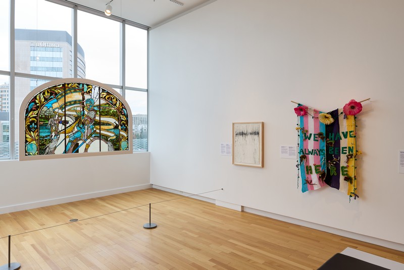 Entering the exhibition on the fourth floor of the OAG, we are greeted by the voice of Bill Staubi coming from Rainbow Flag, in the corner on the right. Save that filmed interview for later. Start with the section called “Flagging,” off to the left at the back. Its large stained glass window depicting Jeanne d’Arc on horseback overlooks Ottawa.
